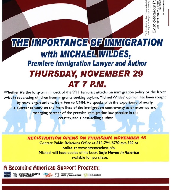 Managing Partner Michael Wildes is guest author at East Meadow Public Library, where he focused on the importance of immigration and discussed his new book Safe Haven in America: Battles to Open the Golden Door, which draws on over a quarter of a century of Michael’s practice in the immigration field, November 29, 2018.
