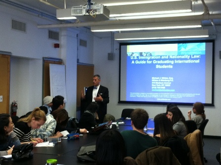Mr. Wildes explained, to a captivated audience of nearly 30 bright individuals, the different options available to them as The New School’s international graduating class of 2013. Most of these individuals desire to put into practice the theoretical lessons learned in the classroom. Through the use of Power point, Mr. Wildes was able to demonstrate the employment authorization options these F-1 visa holders could possibly avail themselves of. Specifically, Mr. Wildes covered STEM, OPT, how to obtain a social security number, as well as a discussion on a variety of nonimmigrant visa options such as B-1/B-2, H-1B, J-1, L-1, TN, etc. Moreover, Mr. Wildes emphasized that it was of paramount importance that these individuals maintain proper immigration status at all times. A question and answer session proceeded the lecture.