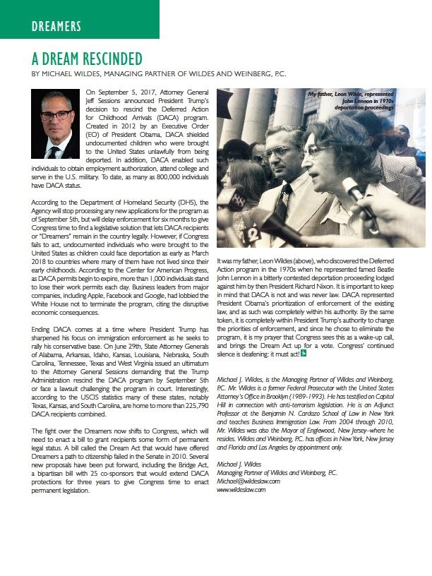 His firm, Wildes & Weinberg, P.C. was founded in 1960 by Senior Partner, Leon Wildes, Michael’s father, who is best known for his successful representation of former Beatle John Lennon in his deportation proceedings, the circumstances of which inspired legislation, documentaries, and books. As a niche firm, the multi-lingual staff of Wildes & Weinberg, has experience in all areas of U.S. Immigration law including:  employment and investment-based immigration, work permits, permanent residence for qualified individuals, family-based immigration, asylum applications, all temporary and permanent type visas, naturalization, and Form I-9 compliance and has been servicing the immigration needs of prominent American and International corporations, banks, industrial, financial and manufacturing concerns, as well as law firms in connection with the personnel needs of their foreign national employees.  Despite difficulties currently being encountered in dealing with U.S. immigration authorities, the firm has maintained an extraordinary track record for success in its cases.