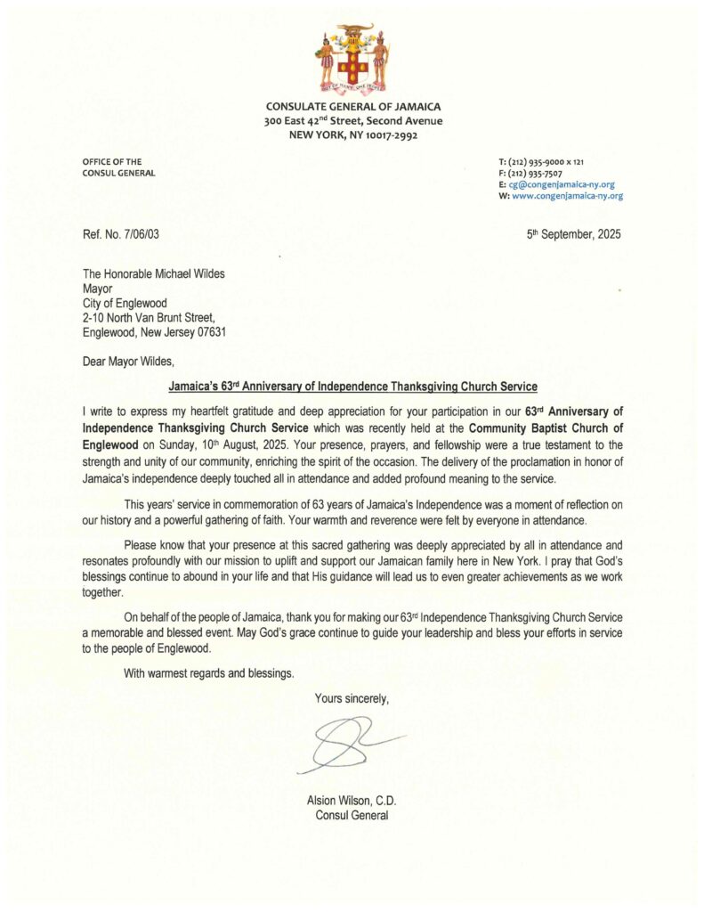 Wildes & Weinberg, P.C. Managing Partner Michael Wildes also Mayor of Englewood, NJ participated in Jamaica’s 63rd Anniversary of Independence Thanksgiving Church Service by addressing the worshippers at the Community Baptist Church of Englewood, NJ. The gathering, together with the proclamation issued, supports the Jamaican constituents located in and around Englewood.